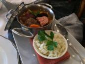 ランチョンマットの紡ぐカフェ文化をめぐる空想が空腹感で途切れる頃、ビールとサラダを昨夜、笑顔で応対してくれた女性スタッフが運んできた。サラダときたら、すごいボリュームで二人が必死に頑張っても食べ切れそうもない。冷えたビールにピッタリである。次いでメイン・ディッシュが登場する。金属のボールにポルト名物トリッパが行儀よく収まっている。別の皿にご飯がふんわり盛ってある。両者を合わせると絶妙のハーモニーが醸し出される。そこにグッドタイミングで赤ワインが出て来る。濃い目でざらっとした腰の強い良品といえる。香りより味で勝負と主張する。満腹で目がぐるぐるし始めたところにデザートが姿を現わす。頭を突き抜けるラバダーナの強烈な甘みに腹の重圧感がさっと消える。これを和らげるようにカモミール・ティーが喉を流れる。